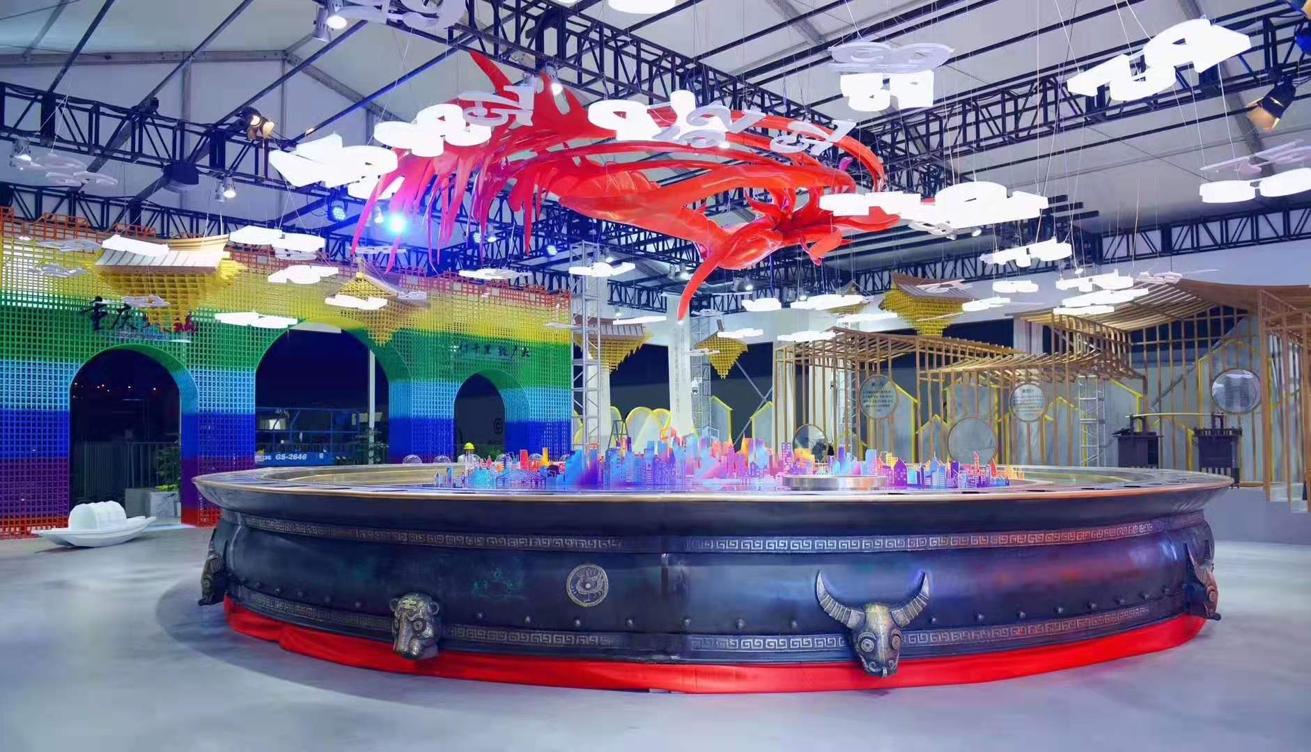 像個小型游泳池的鍋面被分成“紅湯”和“清湯”兩部分,沸騰著冒起泡泡和熱氣,迎來了各展團的客商代表。商務(wù)部部長助理任鴻斌和重慶市副市長熊雪為這口以“非物質(zhì)文化遺產(chǎn)體驗”名義來到會場的火鍋舉行開鍋儀式。
